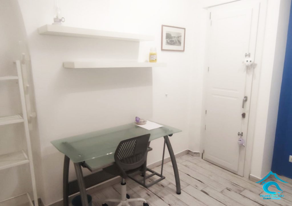 E’ composta da 2 camere da letto, 1 matrimoniale e 1 usata come studio e dotata di divano letto singolo, servizio completo con doccia, cucina abitabile, spazio esterno attrezzato e di pertinenza ESCLUSIVA, lavatrice, parcheggio gratuito in area pubblica.