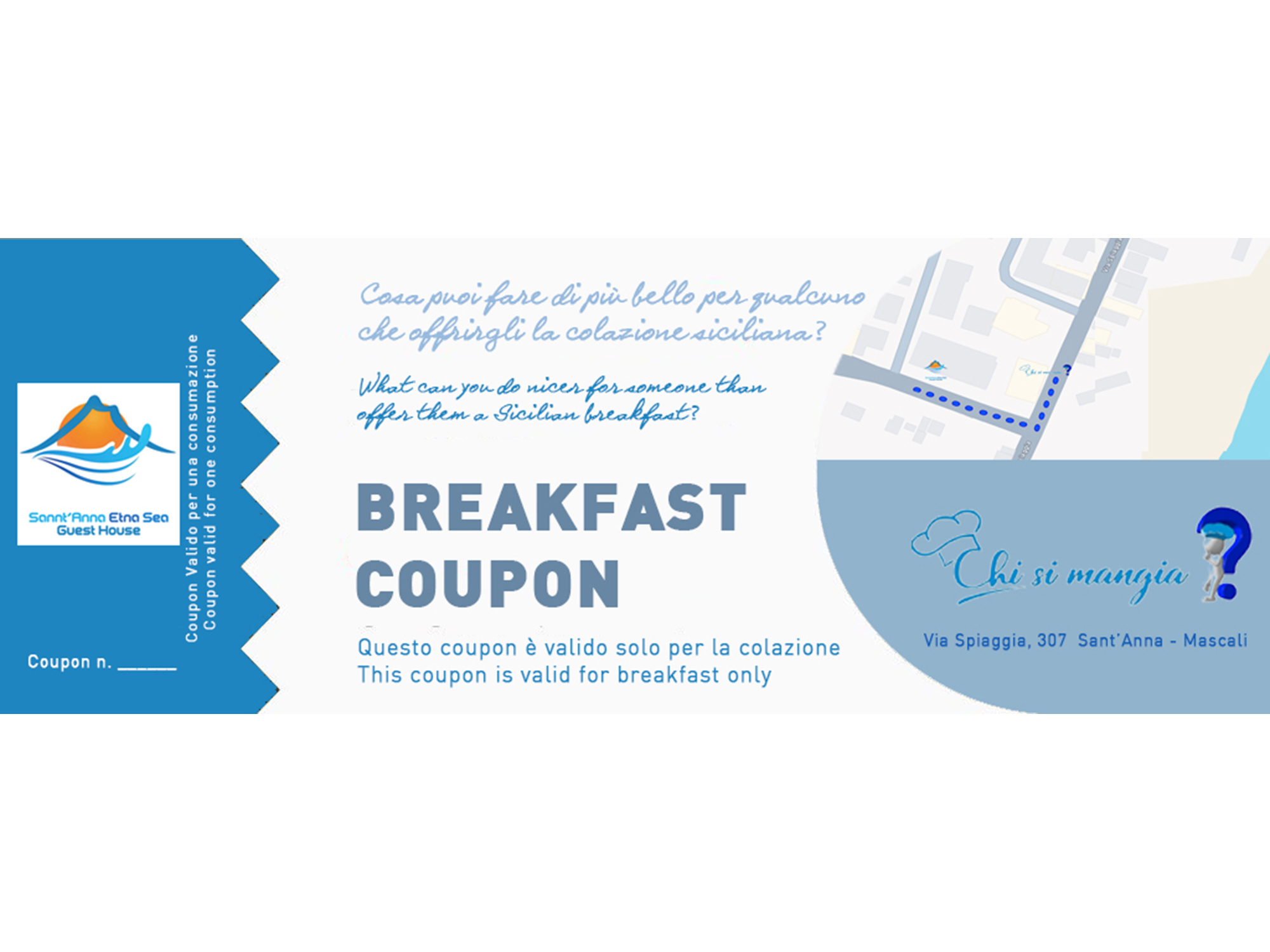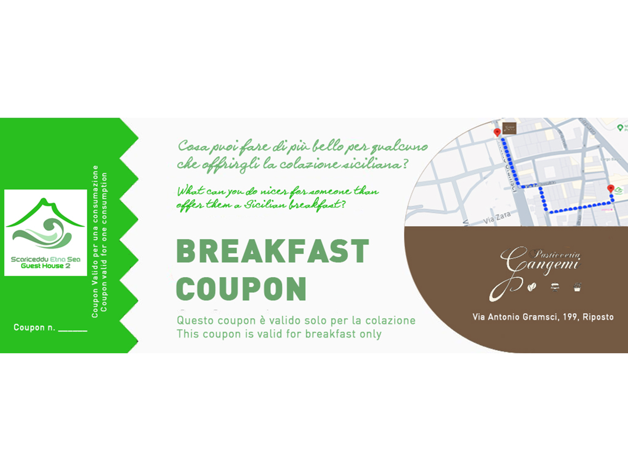 Al check-in. riceverai i coupon per poter usufruire ogni mattina e per tutti gli ospiti della colazione, che sarà presso bar-pasticcerie-gastronomie del territorio, partner della nostra organizzazione.